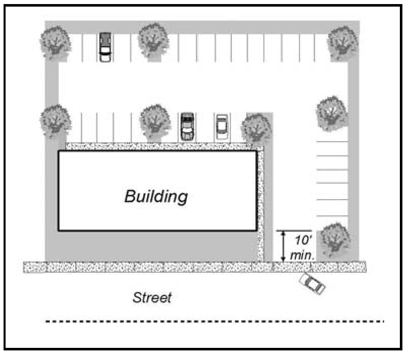 Adjacent to Streets. Parking areas for nonresidential uses adjoining a public street shall be designed to provide a landscaped planting strip between the street right-of-way and parking area equal in depth to the setback required by the zoning district or ten feet, whichever is greater. Required parking areas for residential uses shall not be located within the required setback areas.