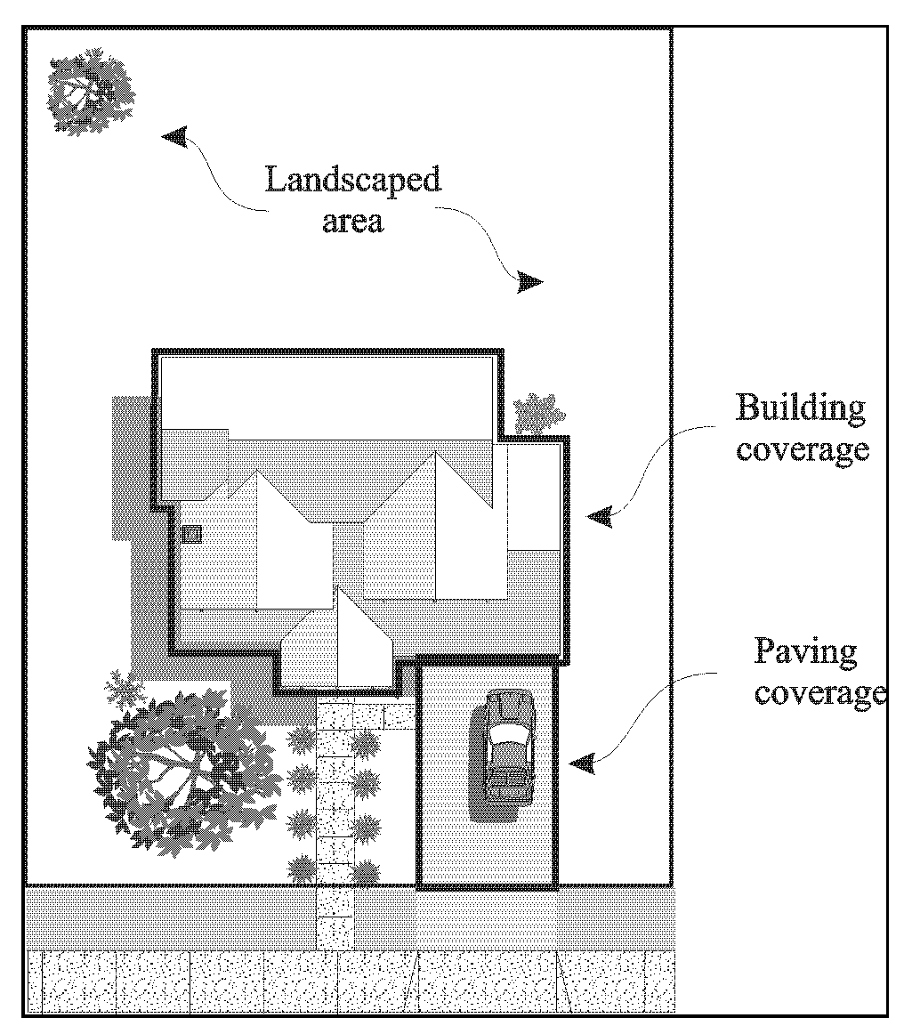 "Site coverage" means the percentage of total site area occupied by structures, and paving for vehicle use. Structure/building coverage includes the primary structure, all accessory structures (e.g., carports, garages, patio covers, storage sheds, trash dumpster enclosures, etc.) and architectural features (e.g., chimneys, balconies, decks above the first floor, porches, stairs, etc.). Structure/building coverage is measured from exterior wall to exterior wall. Pavement coverage includes areas necessary for the ingress, egress, outdoor parking, and circulation of motor vehicles. See Figure 7-4 (Site Coverage).