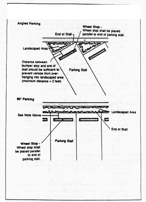 Each parking stall located adjacent to a building, fence, wall or landscaping shall provide a wheel stop as shown on Figure 41-2. Wheel stops shall be constructed of concrete or other materials, as approved by the Superintendent of Building and Safety. No vehicle shall be permitted to overhang required landscaped areas behind wheel stops.