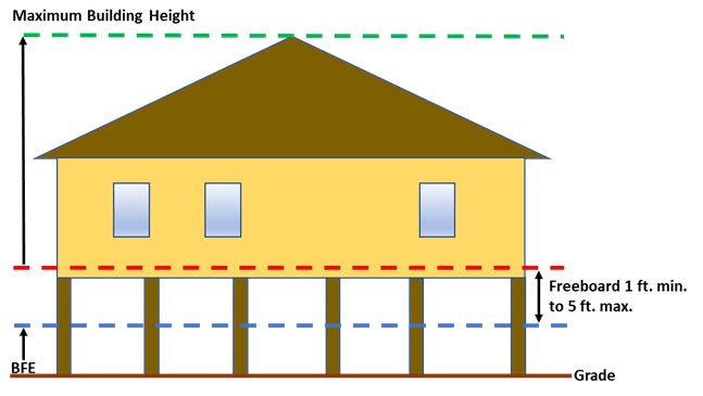 For the purposes of Article IV, Bulk, Maximum height, for all structures and properties in flood hazard areas other than Coastal A Zones, Coastal High Hazard Areas, and seaward of the CCCL, when the average ground elevation is at or below 3.5 feet North American Vertical Datum (NAVD), as determined by the Planning and Zoning Official based on a topographic survey, the vertical distance shall be measured from the Base Flood Elevation (BFE) plus Freeboard, except that in no case shall the vertical distance of the Freeboard exceed a maximum of five (5) feet. The building height shall be measured from the selected Freeboard to the highest point of any portion of the building (see illustration below).