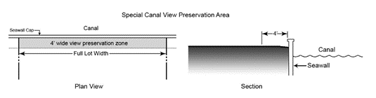 There shall exist on all properties located within the special canal view preservation area a canal view preservation zone. The canal view preservation zone shall be a four-foot wide area immediately landward of the landward edge of the seawall cap, across the entire width of canal frontage. Except as provided below, the canal view preservation zone shall be open to the sky. See graphic, provided for illustrative purposes, below.