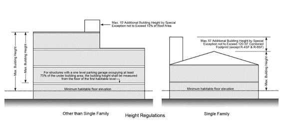 The height of the first story, as defined in Section 158.144, shall not exceed ten feet above the finished floor of the principal structure or 15 feet above the required base flood elevation, whichever is less; and