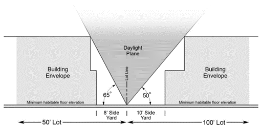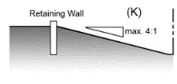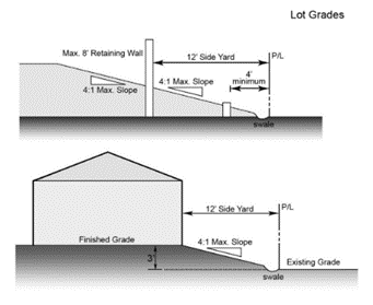 Lot grades between any property line and a structure shall not exceed a maximum slope of one vertical unit to four horizontal units at any point along the slope. A retaining wall may only be constructed for the purpose of achieving the required one-to-four slope over a minimum distance of four feet unless the wall meets the required setback. In any event, the retaining wall cannot exceed eight feet in height. See graphic, provided for illustrative purposes, below.