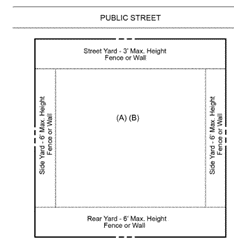 In required yards, only an open-wire-mesh fence shall be permitted not exceeding a height of 12 feet. No court lights shall be permitted in an R-4SF or R-6SF district. In other districts, upon application, court lighting may be permitted of such a type, intensity, frequency, and design as will not interfere with the public safety or with neighboring uses. In determining the maximum coverage of a lot by a building, courts shall be counted in the computation if they are not open space. (See Subsection 158.030(E).)