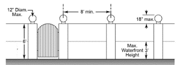 Pool fences located in required gulf waterfront yards shall only encircle the minimum area necessary to ensure child safety, and such area shall not exceed a distance of 20 feet around the perimeter of the pool, pool curb, diving boards, diving towers and slides.