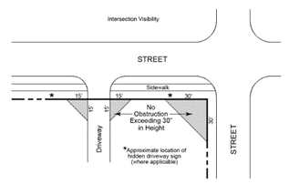 At all driveways that cross a sidewalk, no obstruction to vision (other than an existing structure, post, fixed sign, column or tree) exceeding 30 inches in height above the established grade of the street at the property line shall be erected or maintained on any lot within the triangle formed by the street lot lines of the lot and a line drawn between the points (along the street lot line and the driveway for a distance of 15 feet from their point of intersection). In the event there is an existing permitted obstruction blocking visibility within this angle, a warning sign not to exceed two square feet shall be erected not less than ten feet from the sidewalk on the right side of the driveway. See graphic, provided for illustrative purposes, below.
