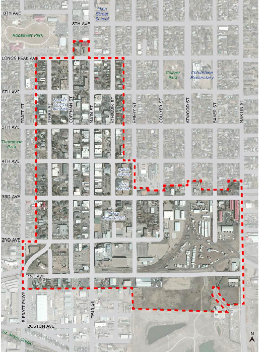 Transition Areas: Coffman Street, Kimbark Street, Terry Street and 4th, 5th, 6th and Longs Peak Avenues.