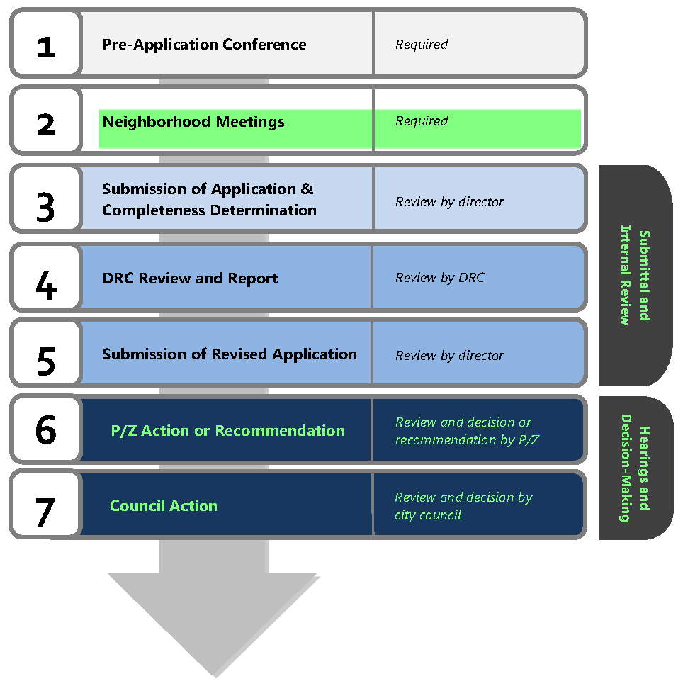 Review actions (quasi-judicial). The city council acts in a review, or quasi-judicial, capacity when it acts as an appeal body of decisions from the planning and zoning commission (P/Z) and when it acts on small-scale rezonings and comprehensive plan land use amendments. Like a court, it reviews those decisions to determine whether they are consistent with the requirements of this development code and supported by the evidence in the record of the public hearing before the P/Z, and whether the P/Z exceeded its authority or abused its discretion.