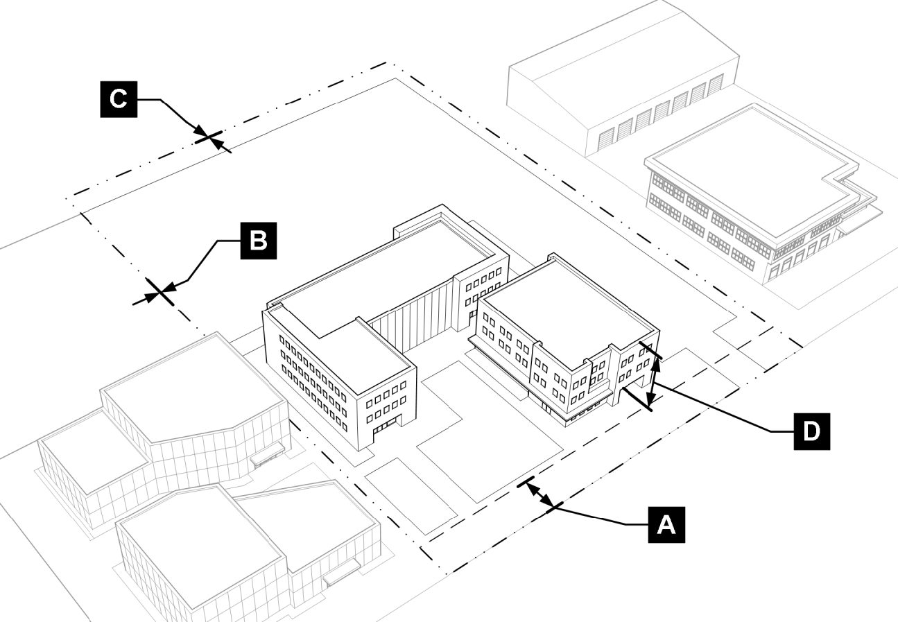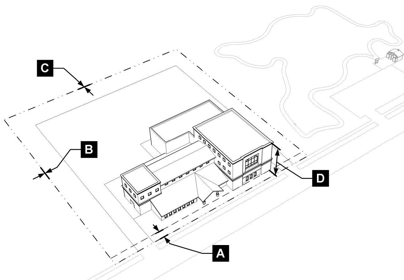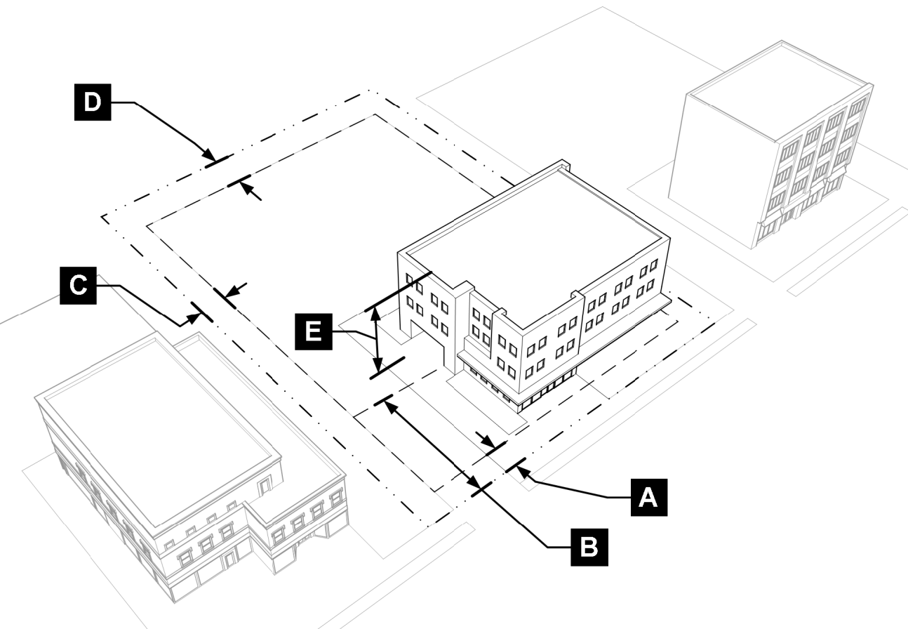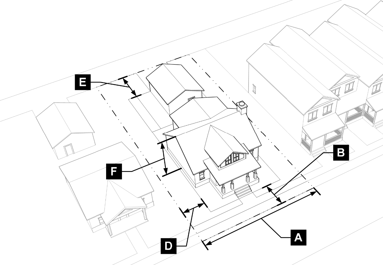 Each base zoning district includes a summary table of dimensional standards. The labels in the table correspond to the applicable illustration. The tables may not identify all standards that may apply to a development. Where two standards are listed for a particular dimension, both shall apply.