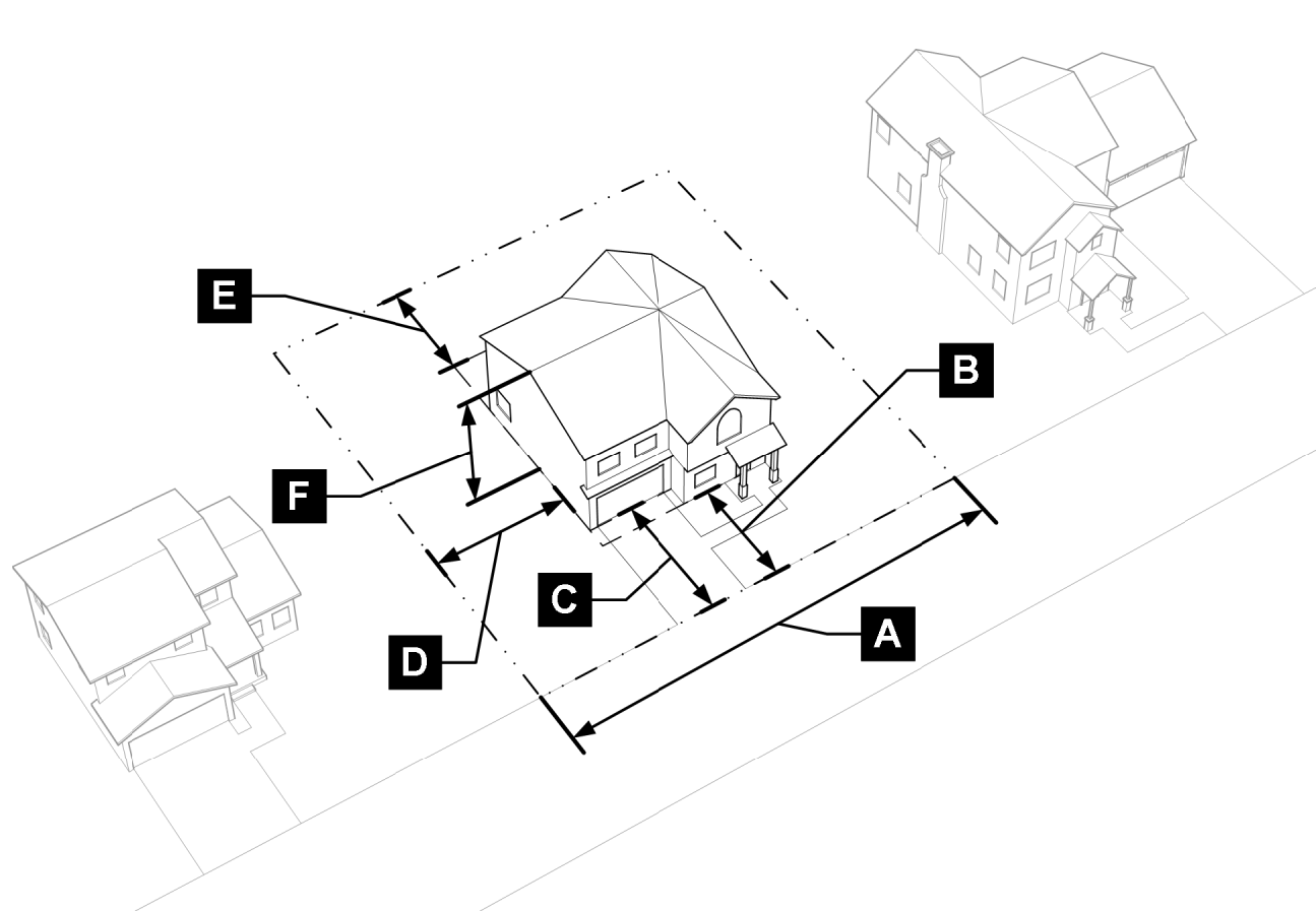 Each base zoning district includes an illustration demonstrating the applicable dimensional standards for that district.