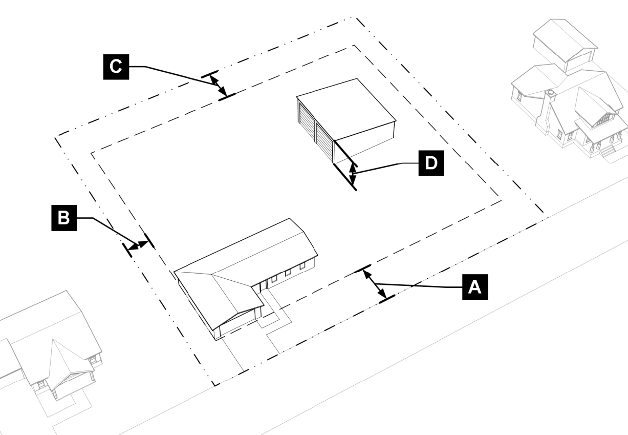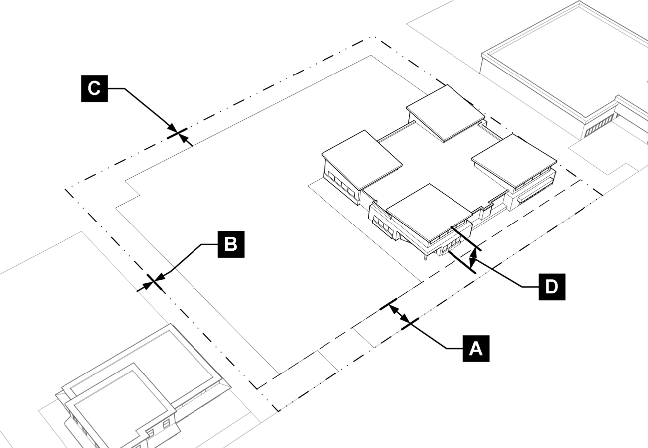 Except for rear setbacks from non-dedicated alleys, setbacks are the distance between the nearest property line and the closest projection of a building or structure along a line at right angles to the property line.