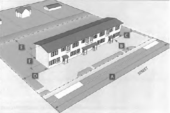 The primary entrance to a building shall be clearly distinguished from the rest of the building by transparent windows and doors, materials, size, projections or recessions, or other techniques.