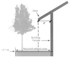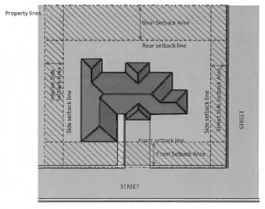 A setback is the minimum required distance between the established lot line and any building on the lot or, where the lot line is within a street or access easement, the edge of the street or easement and any building on the lot.