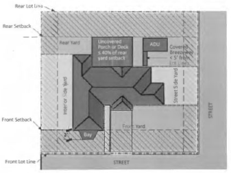 Covered patios, porches, or decks attached to the primary building may occupy a maximum of 40 percent of the required rear setback area provided that the space under the cover is open on at least three sides and the eave of the patio or porch cover may encroach up to two feet into a required side or rear yard setback, but not closer than three feet from any lot line.