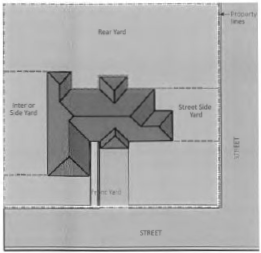 Street side yard refers to the part of a lot from a street side lot line the side façade of the primary building.