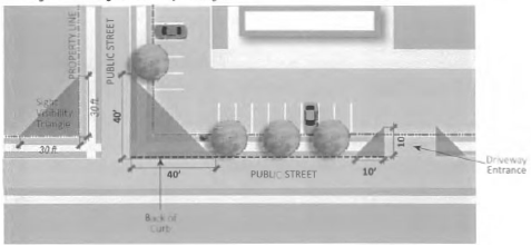 Site entrances and driveways in all developments shall maintain a sight triangle area formed by joining points measured 30 feet along the property lines or 40 feet along the face of curb from the intersection of two streets, whichever is greater, or by joining points measured ten feet back along a driveway and the face of curb from the point of intersection of the driveway and street for the safety of pedestrians, bicycles, and vehicles, see Figure 24: Sight Visibility Triangles.