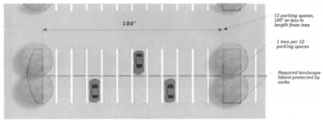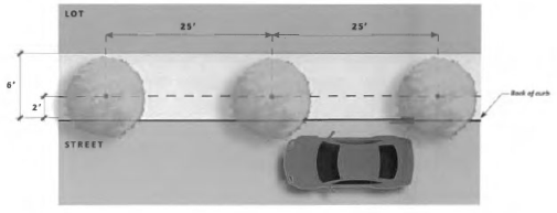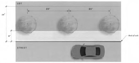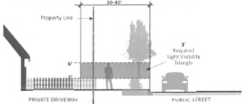 Landscaping, fences and walls, and shrubs shall not exceed three feet within the required sight visibility triangle. Signage and trees between three feet and seven feet tall are prohibited within the required sight visibility triangle. See Figure 25: Restrictions in Sight Visibility Triangles.