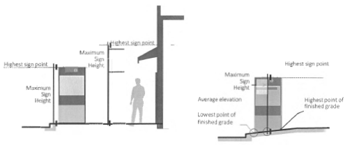 Sign height is measured as the vertical distance from the average elevation of the finished grade to the top of the highest attached component of the sign. If natural grade at the base of a sign is lower than the grade of an adjacent road, the height of the sign may be measured from the top of curb elevation.