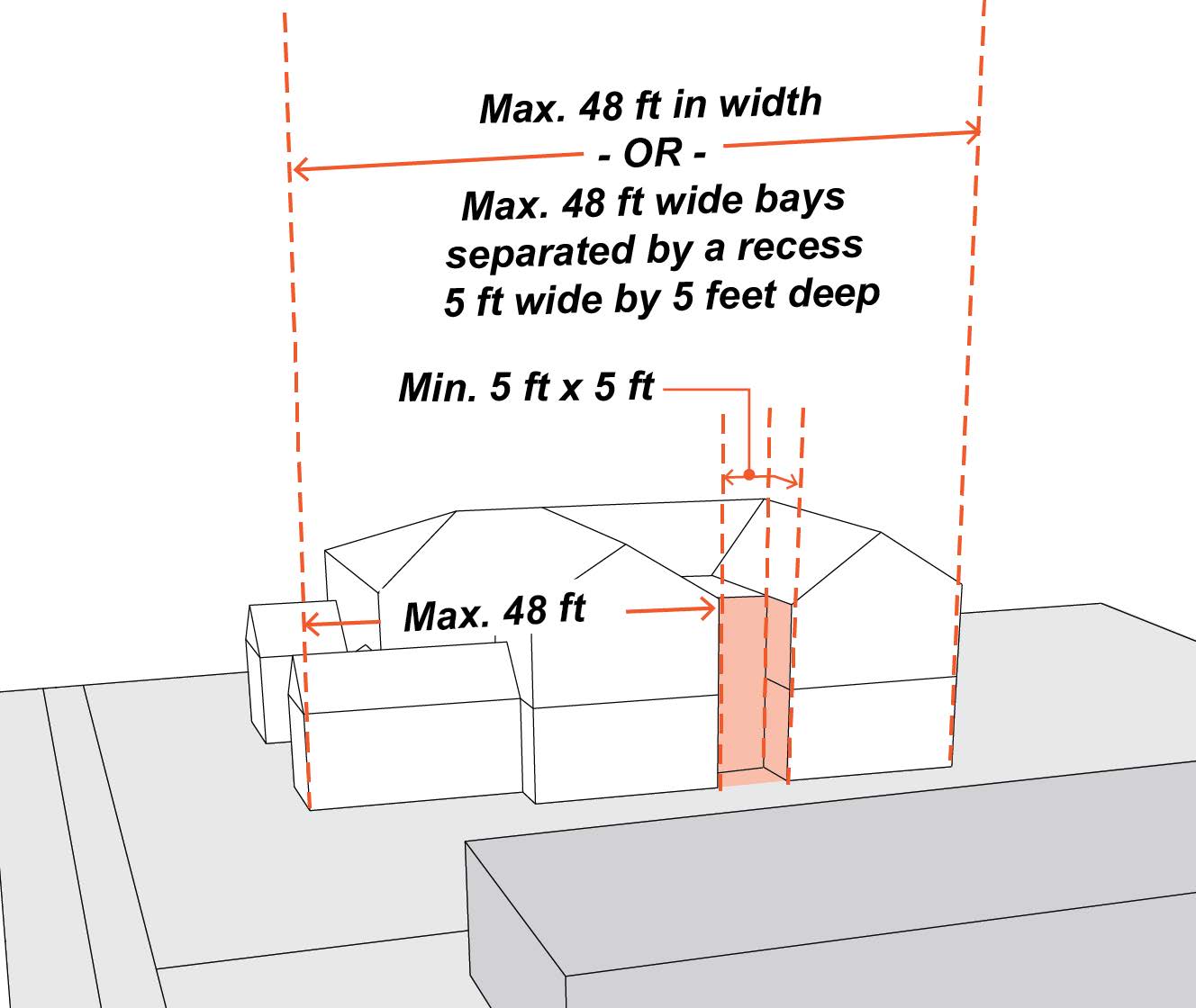 When a building façade abutting an R-1 district exceeds forty-eight (48) feet in width, it must be separated into façade bays no greater than forty-eight (48) feet by a recess five feet wide and five feet deep.