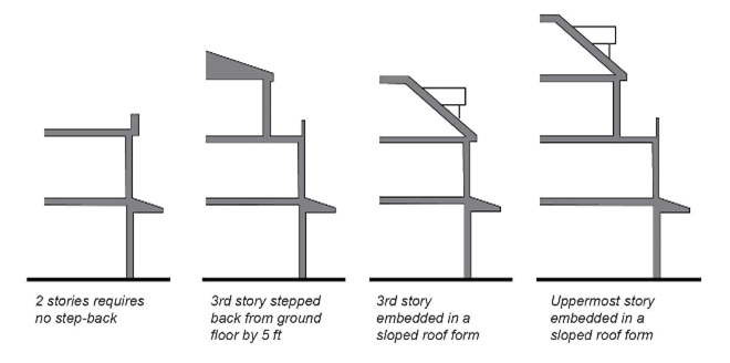 The third story must be either stepped back a minimum five feet from ground floor façade or embedded in a sloped roof form.