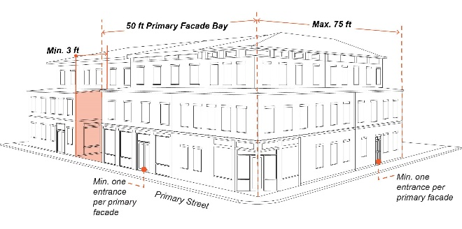 A minimum one entrance shall be provided per primary façade bay.