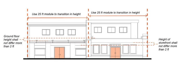 Shopfronts more than twenty-five (25) feet in width must incorporate variations in bulkhead, awnings, materials and/or color to visually articulate the shopfront into modules not to exceed twenty-five (25) continuous feet.