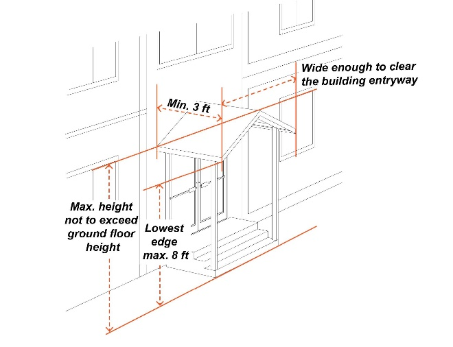 The lowest edge of a projecting awning or door canopy shall have a vertical clearance of no more than eight feet.