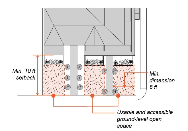 Ground Level Open Space. Where any required front, rear, or side yard setback is ten (10) feet or greater, on-site ground-level open space shall be provided within the setback.