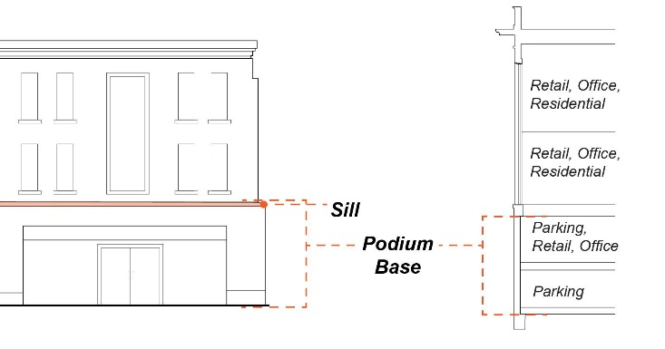 Podium: The base material encompasses the lowest story (or stories) of the building, with or without mezzanine(s), and terminates in a sill, string course, or cornice at its upper bound (multi-story buildings only).