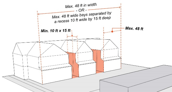 When a building façade abutting an R-1 district exceeds forty-eight (48) feet in width, it must be separated into façade bays no greater than forty-eight (48) feet by a recess ten (10) feet wide and fifteen (15) feet deep.