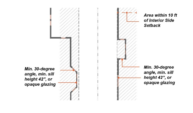 Primary living spaces and balconies located along a side setback shall orient principal windows and balconies toward the front and rear of the building.