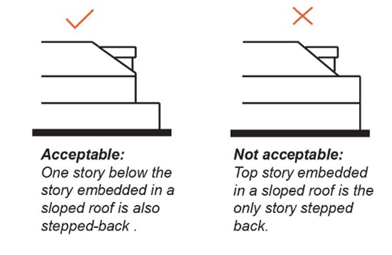 Along all frontages, the third story must be either stepped back a minimum five feet from the ground floor façade or embedded in a sloped roof form such as a mansard roof or a hipped and/or gabled roof with dormers.
