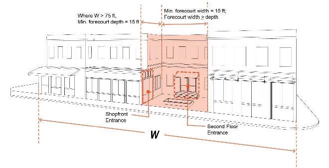Forecourts must feature at least one entry to a shop and/or second floor use.