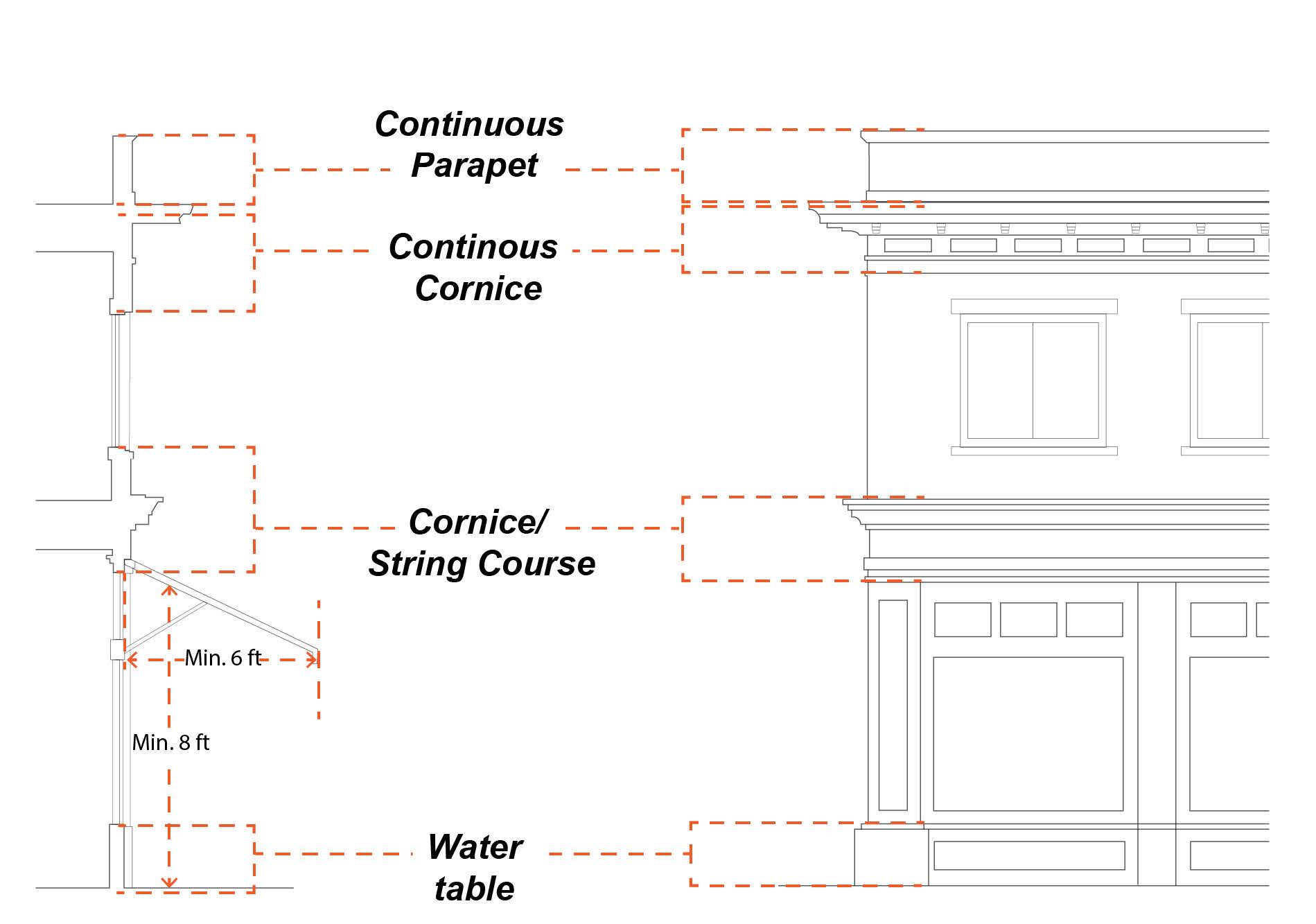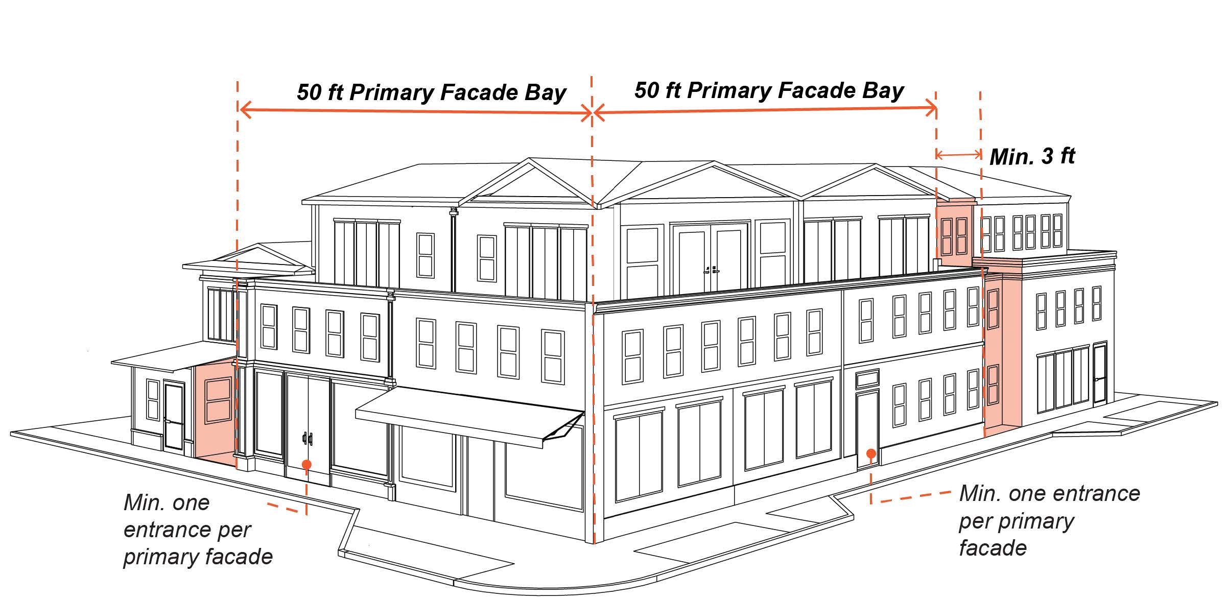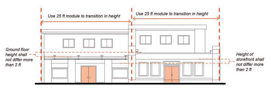 Continue the pattern and scale established by existing buildings by requiring building designs that express the underlying twenty-five (25) foot frontages originally established, either by building structure or by architectural design;