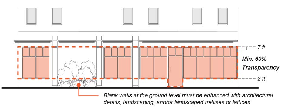 Encourage pedestrian-scale design and minimize blank walls and other dead spaces at the ground level;