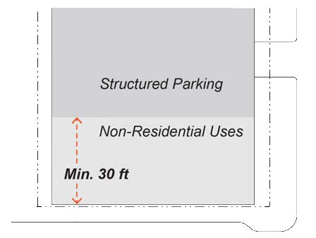 "Lined" with ground-floor non-residential uses at least thirty (30) feet deep as measured from the front façade; or