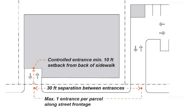Controlled entrances to parking facilities (gates, doors, etc.) shall be located a minimum ten (10) feet from the back of sidewalk.