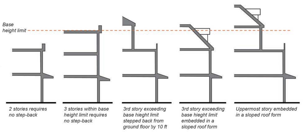 Street Side: Minimum ten (10) feet from ground floor façade for stories above thirty (30) feet in height (commercial or mixed use) or thirty-five (35) feet (residential only) as shown in the diagram.