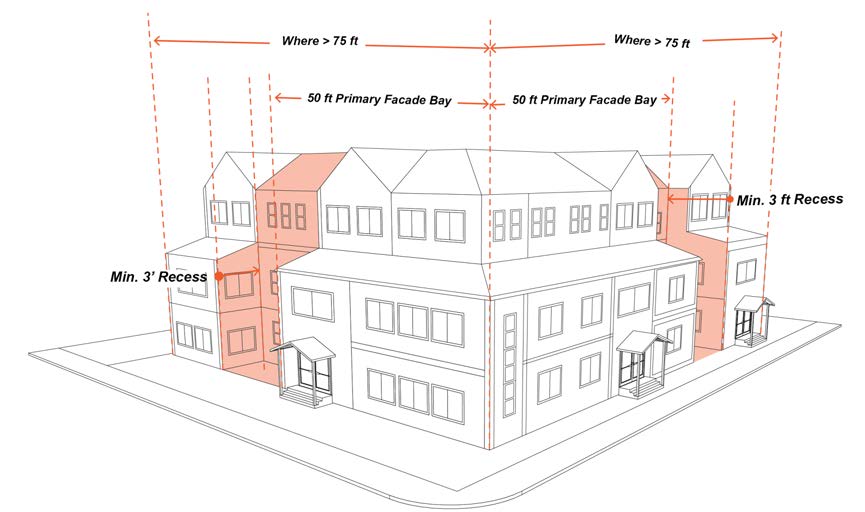 Entry Protection. Primary street-facing entrances shall be protected by a recess in the building frontage at least three feet deep or by a projection extending outward at least three feet measured horizontally from the entrance, and wide enough to clear the building entryway on both sides.