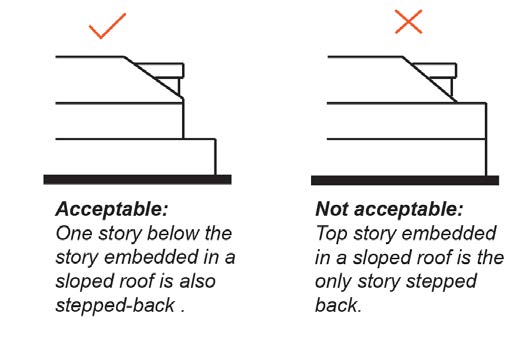 For buildings over three stories, the uppermost story must be embedded in a sloped roof form such as a mansard roof or a hipped and/or gabled roof with dormers, as allowed by standards in Section 14.52.110.A.6.