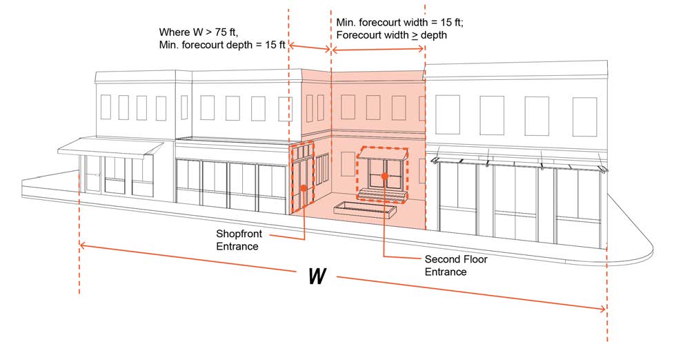 A minimum width of four feet for entries to courtyards or individual single businesses.