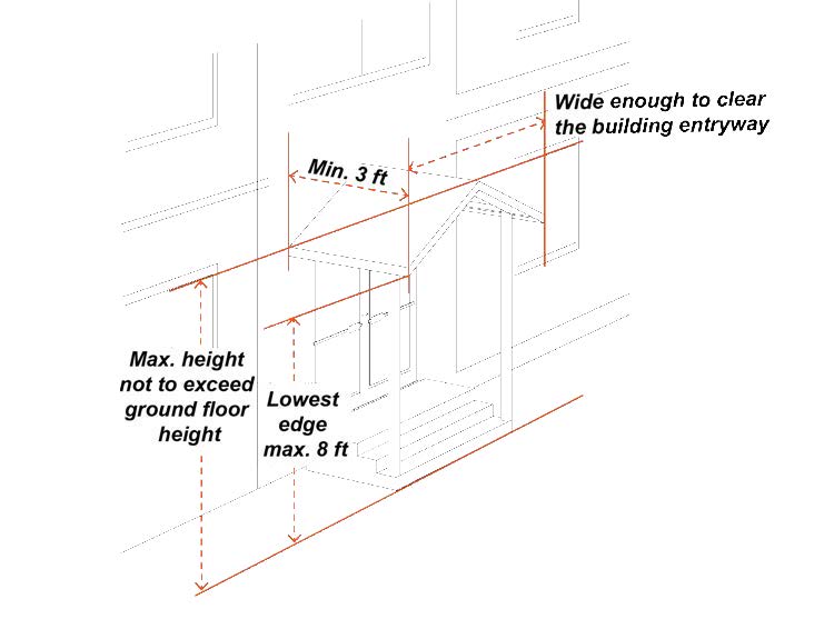 The lowest edge of a projecting awning or door canopy shall have a vertical clearance of no more than eight feet.