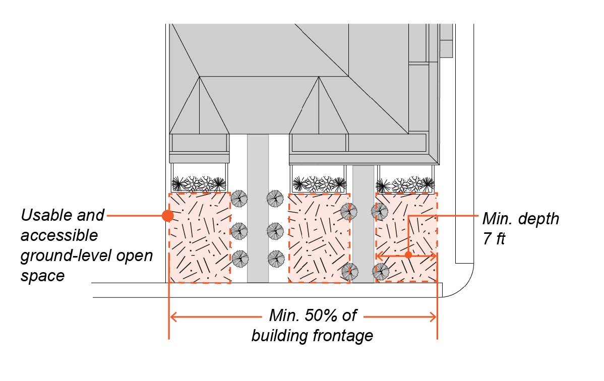 Ground Level Open Space. The required front setback area for residential-only development must be improved with a usable open space a minimum of seven feet in depth for a minimum fifty (50) percent of the building frontage.