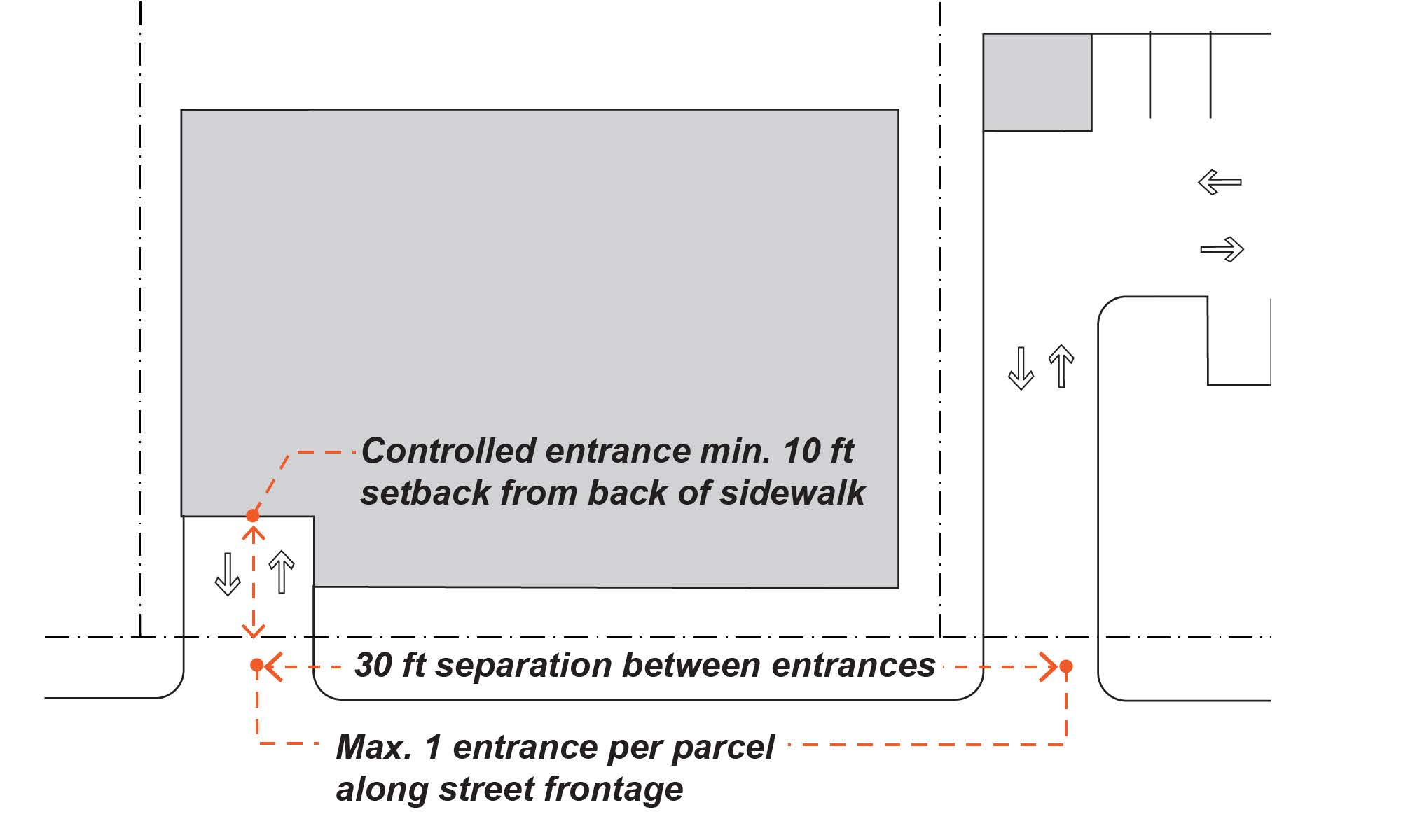 Controlled entrances to parking facilities (gates, doors, etc.) shall be located a minimum ten (10) feet from the back of sidewalk.