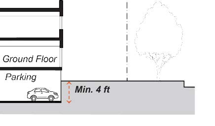 Designed such that the floor elevation is a minimum four vertical feet below the elevation of the adjacent sidewalk.
