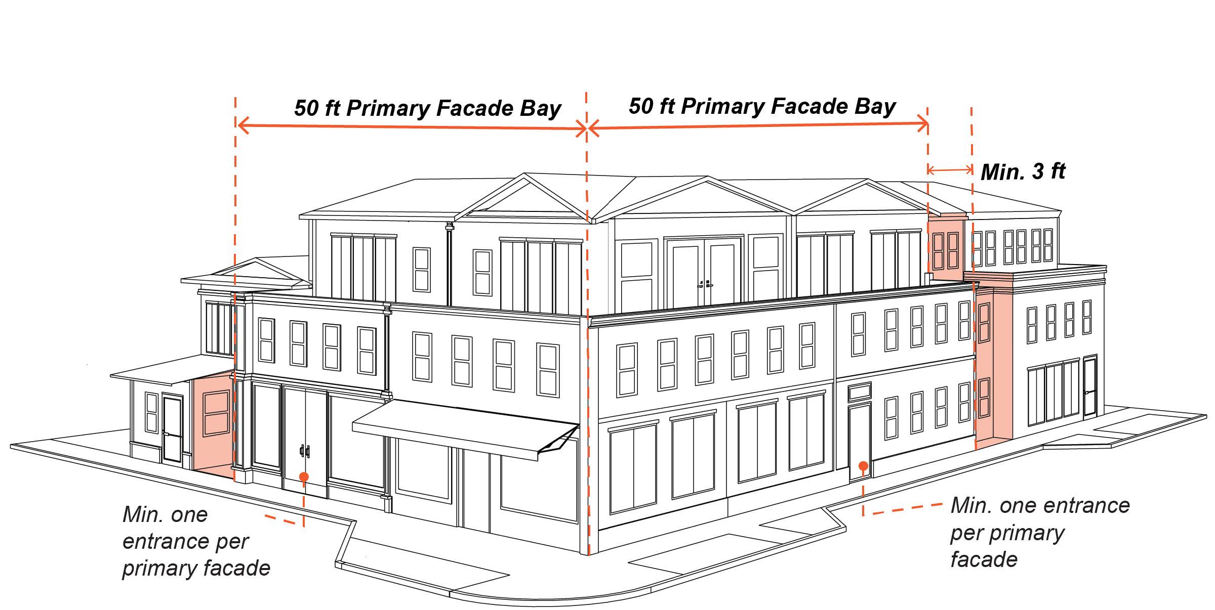 A minimum one entrance shall be provided per primary façade bay.