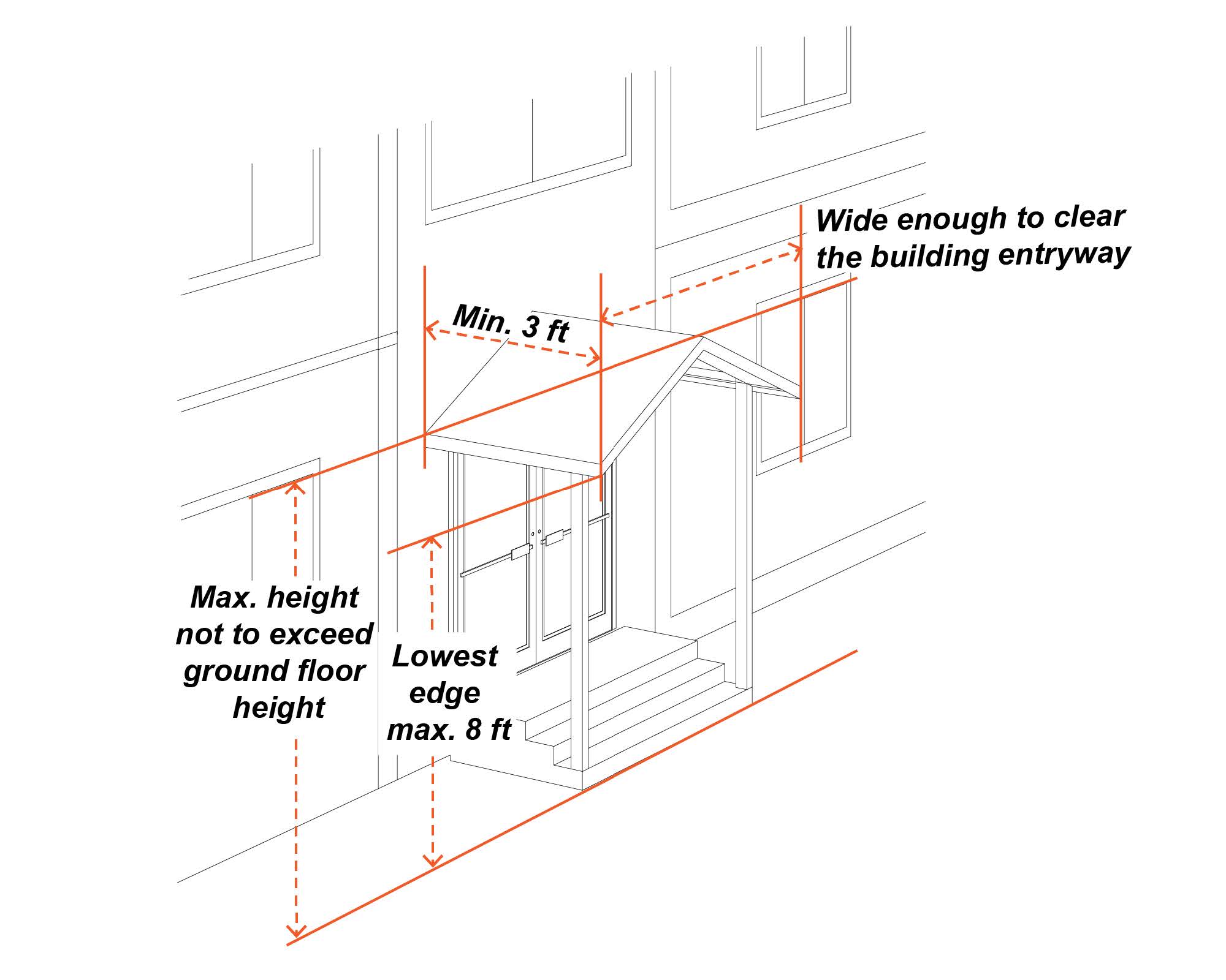 The lowest edge of a projecting awning or door canopy shall have a vertical clearance of no more than eight feet.