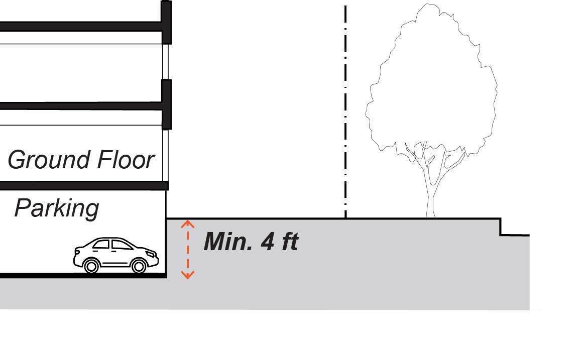 Designed such that the floor elevation is a minimum four vertical feet below the elevation of the adjacent sidewalk.