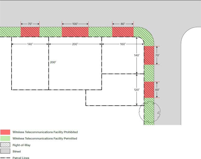 Small wireless telecommunications facilities should be sited at mid-block locations rather than at more visible corners and intersections unless: