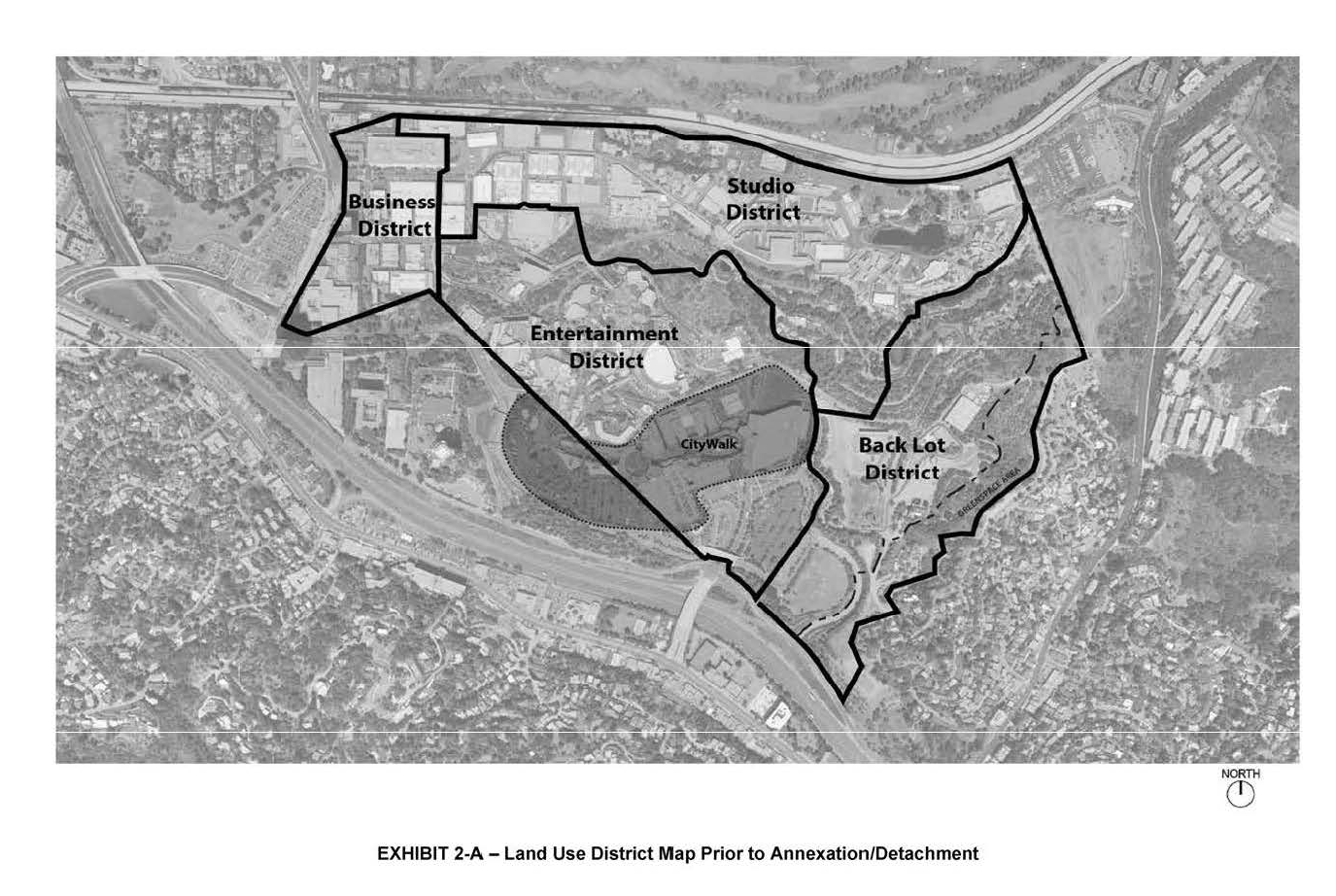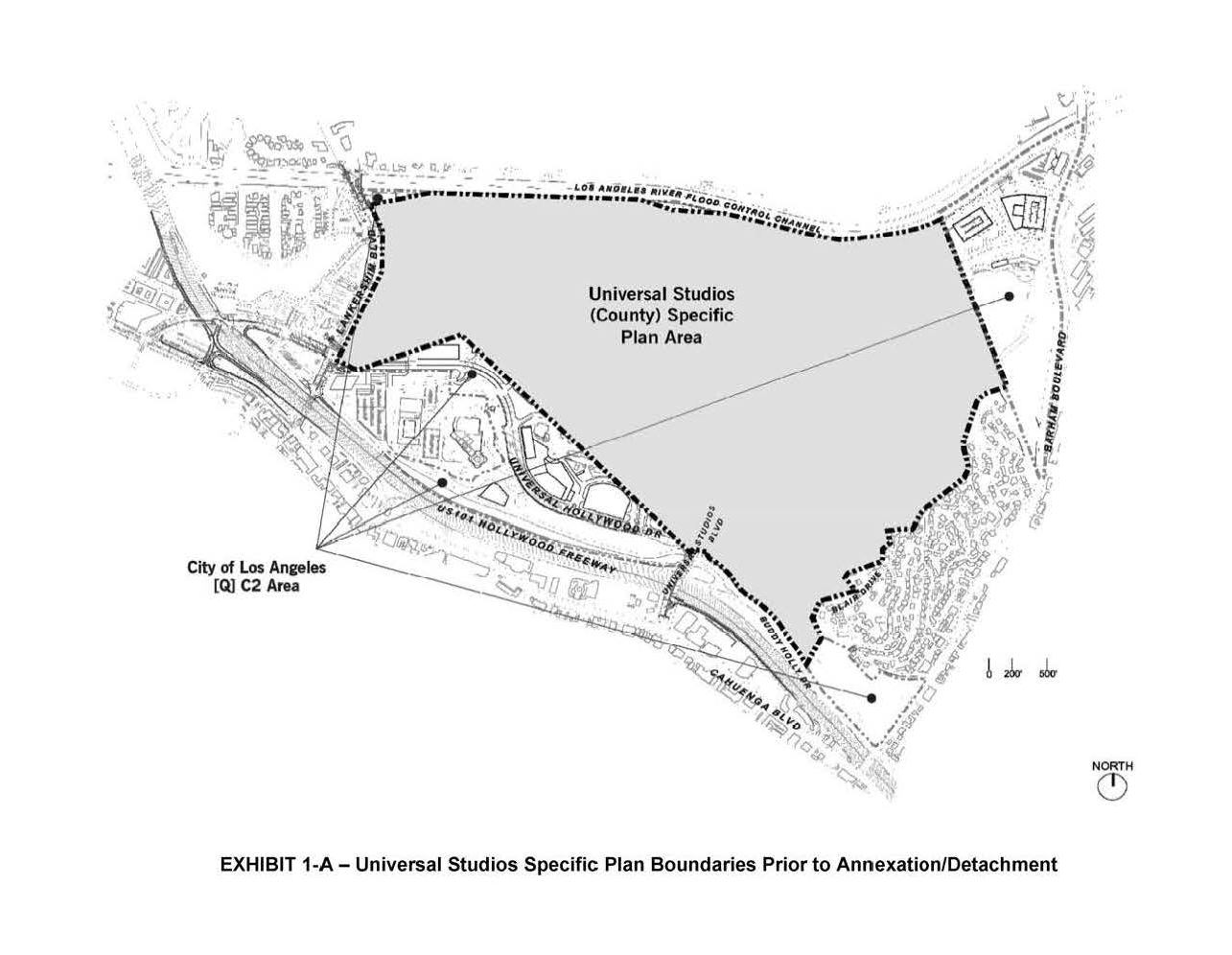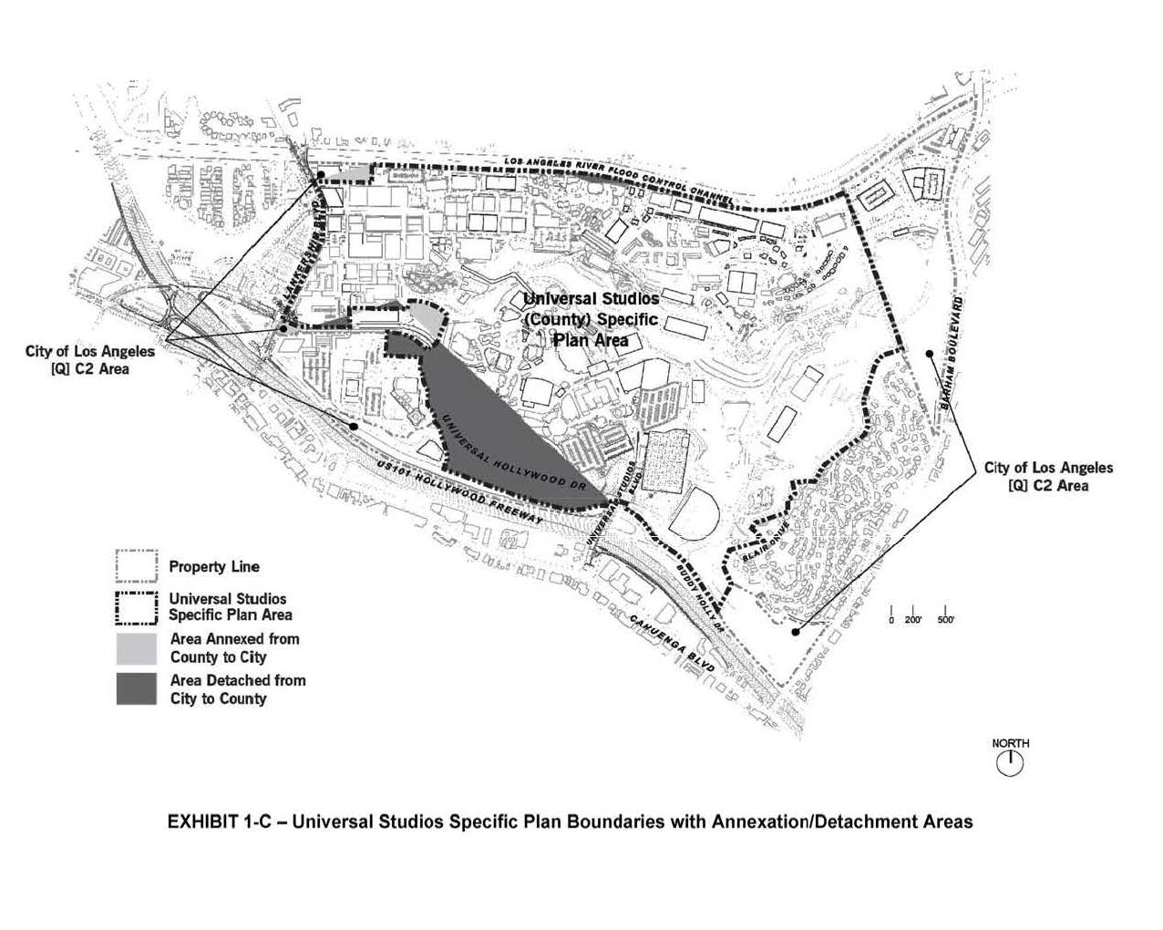 After the effective date of the Universal Studios Specific Plan, portions of the Universal Studios Specific Plan area, existing within the County as of the effective date of this Specific Plan, may be annexed into the City and areas of the NBC Universal properties within the City may be detached from the City and made part of the Universal Studios Specific Plan area, upon approval of the annexation and detachment actions by the Local Agency Formation Commission for the County of Los Angeles. If the proposed annexation and detachment actions are approved by the Local Agency Formation Commission, then the Universal Studios Specific Plan area shall encompass those areas shown within the heavy dashed lines on the Universal Studios Specific Plan Map shown on Exhibit 1-B on the effective date of the annexation and detachment actions. The legal description of the boundaries of the Universal Studios Specific Plan following the proposed annexation and detachment actions is set forth in the zone change ordinance (Ordinance No. 2013-0013Z). Those areas proposed to be detached from the City and returned to the jurisdiction of the County are shown on Exhibit 1-C. If the Local Agency Formation Commission modifies the areas of annexation and detachment shown on Exhibit 1-C, the Director is authorized to modify the exhibits and tables of this Specific Plan consistent with the Local Agency Formation Commission's action pursuant to Section 22.408.220 of this Specific Plan.